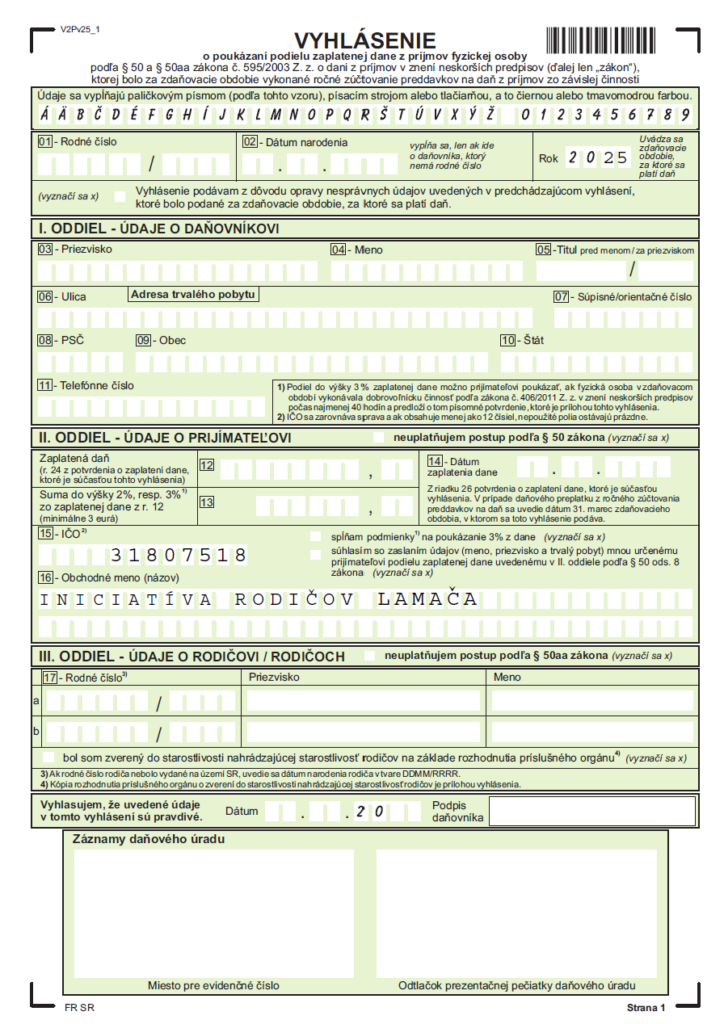 Vyplňte tlačivo Vyhlásenie o poukázaní podielu zaplatenej dane.